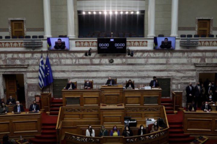 Μέσω τηλεδιάσκεψης μιλά ο Ουκρανός πρόεδρος, Βολοντίμιρ Ζελένσκι, στην Ολομέλεια του ελληνικού Κοινοβουλίου, μετά από πρόσκληση που του απηύθυνε ο Κυριάκος Μητσοτάκης σε επικοινωνία που είχε μαζί του την 25η Μαρτίου.
